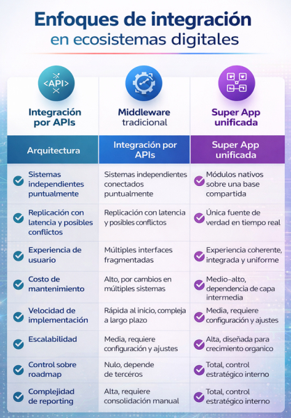 Esta comparación evidencia que no existe solución universal. La integración por APIs puede ser adecuada para necesidades puntuales o presupuestos limitados. El middleware tradicional ofrece un compromiso intermedio. Sin embargo, para organizaciones donde la tecnología es diferenciador competitivo y la operación compleja justifica la inversión, la Super App unificada proporciona ventajas estructurales difíciles de replicar con otros enfoques.
