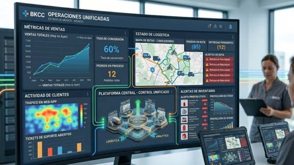 Interfaz de dashboard operativo unificado mostrando visibilidad integral de ventas, logística y métricas de cliente en tiempo real. Fuente: Presticorp, dos mil veinticinco.