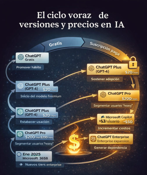 El ciclo de captación y monetización en plataformas de IA publicas comienza con versiones gratuitas que establecen hábitos, progresa hacia suscripciones pagas, y culmina en tiers enterprise costosos que bloquean funcionalidades esenciales en planes básicos, generando dependencia estructural.