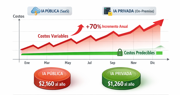 El modelo económico de la IA privada es radicalmente diferente. En lugar de pagar por uso variable, la empresa realiza una inversión inicial en infraestructura y luego asume costos operativos fijos mensuales. Esta estructura permite planificar presupuestos anuales con certeza, independientemente de cuantas interacciones procese el modelo o cuantos usuarios lo utilicen. Para una empresa con 500 usuarios activos, el punto de equilibrio entre IA publica y privada típicamente ocurre entre los 18 y 36 meses. A partir de ahi, la opción privada genera ahorros sustanciales, pero lo mas importante: genera previsibilidad.